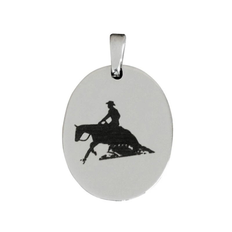 Wunderschöner Anhänger für die Halskette! Reining Liebhaber werden dieses schöne Western-Acessoire lieben. Auf dem silbernen Anhänger ist ein Reining Reiter beim sliden abgebildet. Die Rückseite des Anhängers ist silber ohne Motiv. Der Anhänger ist für Damen und Herren geeignet.