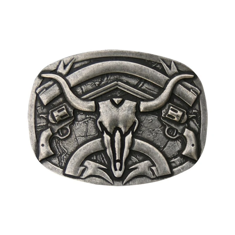 Coole Gürtelschnalle im Hillbilly Style mit Longhorn Schädel und Pistolen. WildWest Fans kommen mit diesem Buckle voll auf Ihre Kosten.