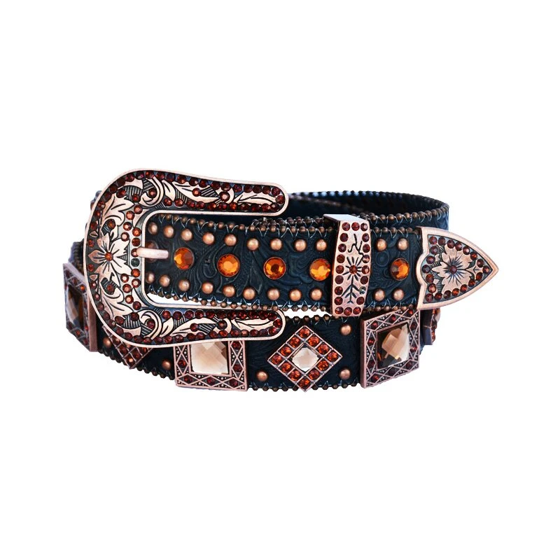 Nobler Damengürtel mit Kupferfarbigen Highlights! Schicker schwarzer Ledergürtel mit Blumenmuster und tollen Strasssteinen! Der schicke Strassgürtel für Damen hat auch eine edle kupferfarbige Gürtelschnalle, die ebenfalls mit Strass besetzt ist. Ein toller Damengürtel, der sich auch bestens als Showgürtel eignet!