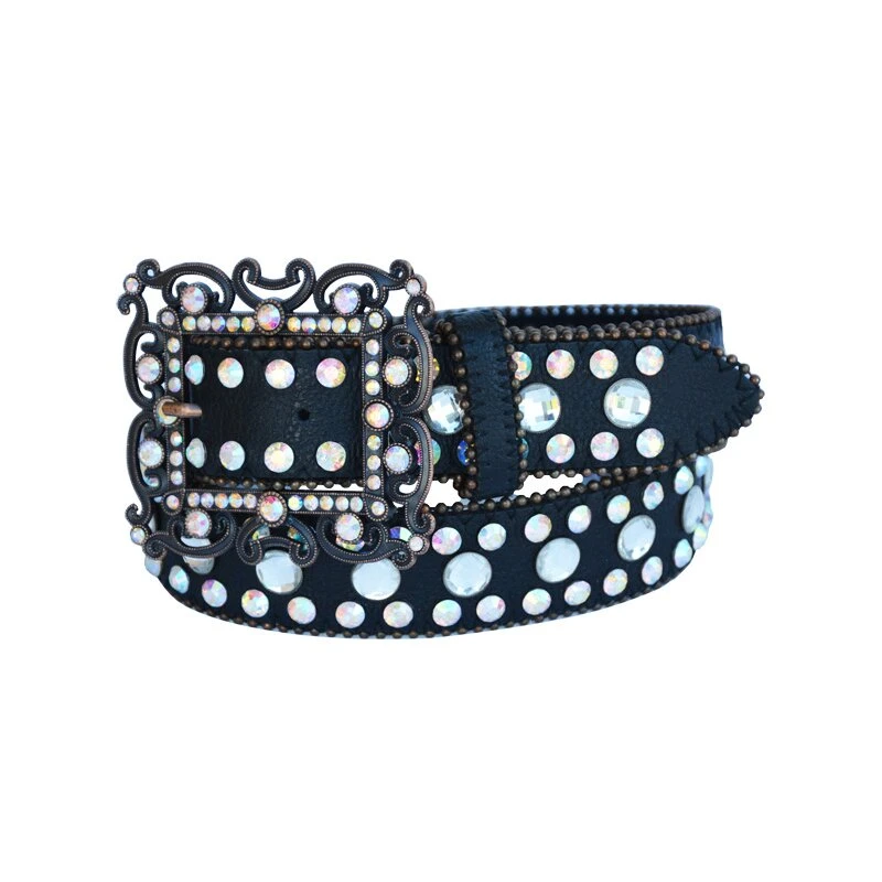Edler schwarzer Damengürtel mit schicker Gürtelschnalle! Ein umwerfend schöner und edler Strassgürtel für Damen mit vielen in Regenbogenfarben schimmernden Strasssteinen! Die filigrane Gürtelschnalle ist sehr edel und wird ebenfalls von Strasssteinen verziert. Ein toller Damengürtel mit absolutem Wow Effekt! Ein toller Ledergürtel für Damen, welcher sich zu vielen Outfits kombinieren lässt und einen glamourösen Auftritt garantiert!