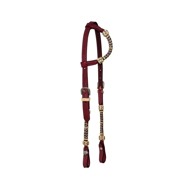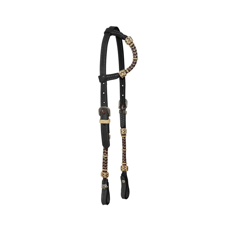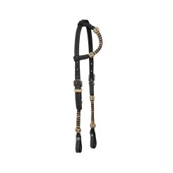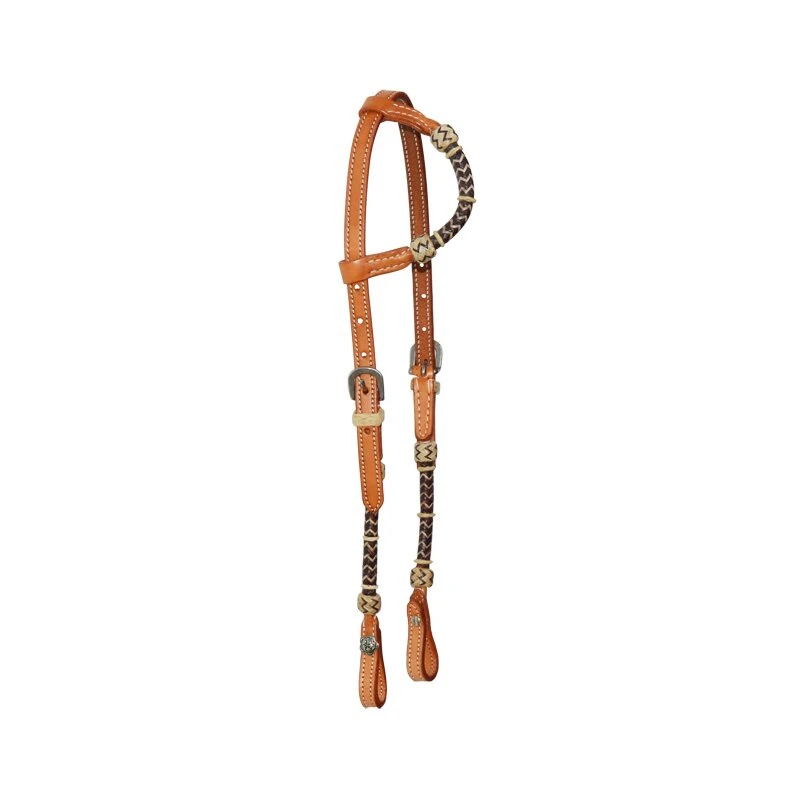 Schicke Einohr Westerntrense für den täglichen Einsatz im Gelände, Reitplatz oder in der Reithalle. Aus hochwertigem US Leder gefertigt hält die Trense allen Anforderungen stand. Auch als Show Kopfstück kann man die Einohr-Trense natürlich nutzen! Ein toller Blickfang der Einohrtrense ist die schicke Verzierung aus Rohhaut an Ohr und an den Backenstücken. Das tolle Einohr Kopfstück gibt es in verschiedenen Farben.