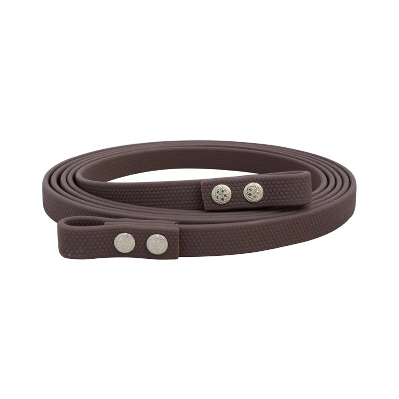 Geschlossene Zügel mit Material aus dem Hause Comfi Cord® das Comfi-Grip Material, welches immer mehr Beliebtheit in der Reiterwelt findet. Die Zügel sind absolut robust, sehr reißfest und wetterbeständig- alles was sich ein Reiter wünscht. Die Zügel mit Grip haben eine grippige Oberfläche, so dass der Zügel auch in nassem Zustand bestens in der Hand liegt. Das Material der braunen Zügel ist super angenehm und scheuert nicht. Die Zügel sind formstabil, verformen und verfärben nicht, egal ob bei Sonne, Regen oder Schnee. Des weiteren fangen die Zügel auch nicht zu stinken an, denn die Grip-Zügel sind geruchsneutral und nehmen keine Gerüche an. Die geschlossenen Zügel sind super einfach zu waschen und schnell zu reinigen, da die Zügel auch nass werden dürfen, ohne dass sich das Material verändert. Besonders im Distanzssport haben die Comfi-Grip Zügel eine sehr große Fangemeinde, da sie bei jeder Witterung ihre ursprüngliche Form und Farbe behalten und auch in nassem Zustand oder in schwitzigen Händen noch super komfortabel sind! Im Winter sind die Zügel ein wahrer Traum, denn auch bei Kälte und Schnee bleiben die Zügel flexibel und komfortabel. Noch ein Vorteil der komfortablen geschlossenen Zügel ist die UV Beständigkeit, so sehen die Zügel auch noch nach langem Einsatz wie neu aus und fühlen sich auch noch so an. Ein must have für alle Distanz- und Freizeitreiter!