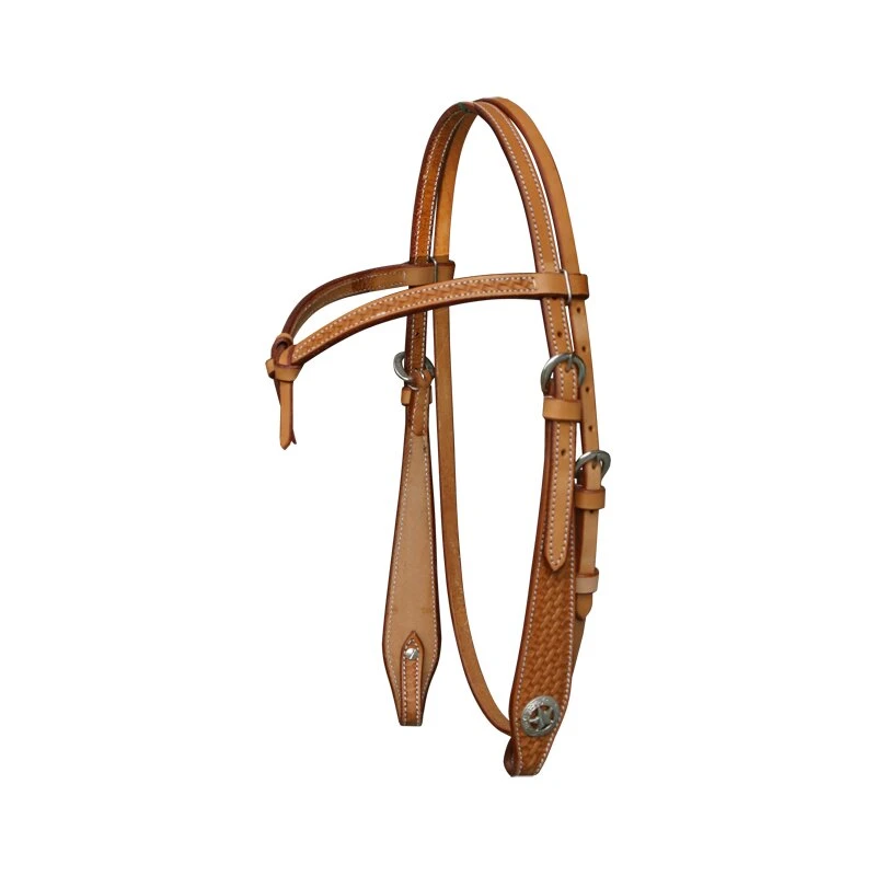 Hochwertiges Western-Kopfstück aus US Leder mit toller Basket-Punzierung und Knotenstirnband. Eine Trense für anspruchsvolle WesternreiterInnen. Als zusätzliches schickes Detail sind unten am Backenstück der Westerntrense ( an der Gebissaufhängung) Conchas mit Stern-Motiv angebracht.