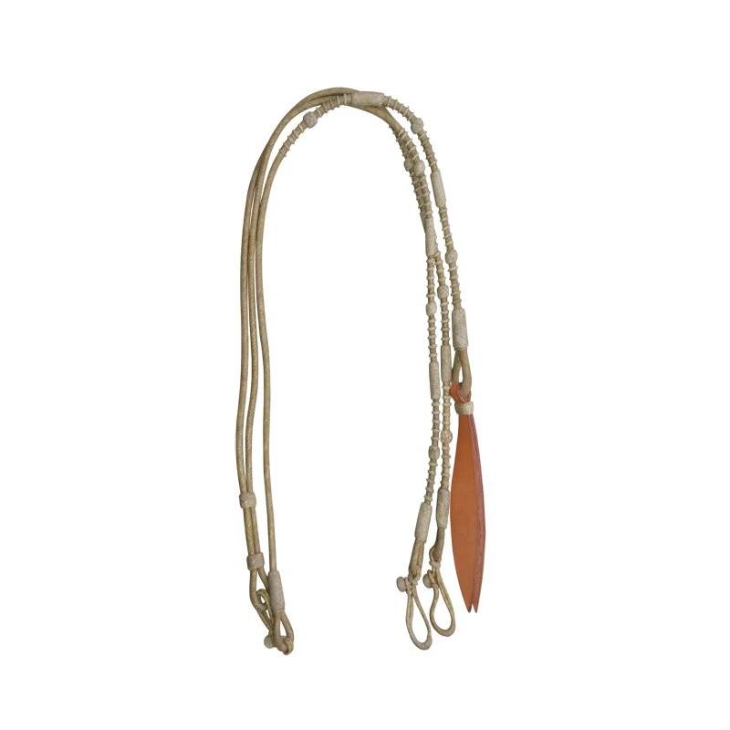 Helle aus feiner Rohhaut geflochtene Romal Zügel mit Lederende.