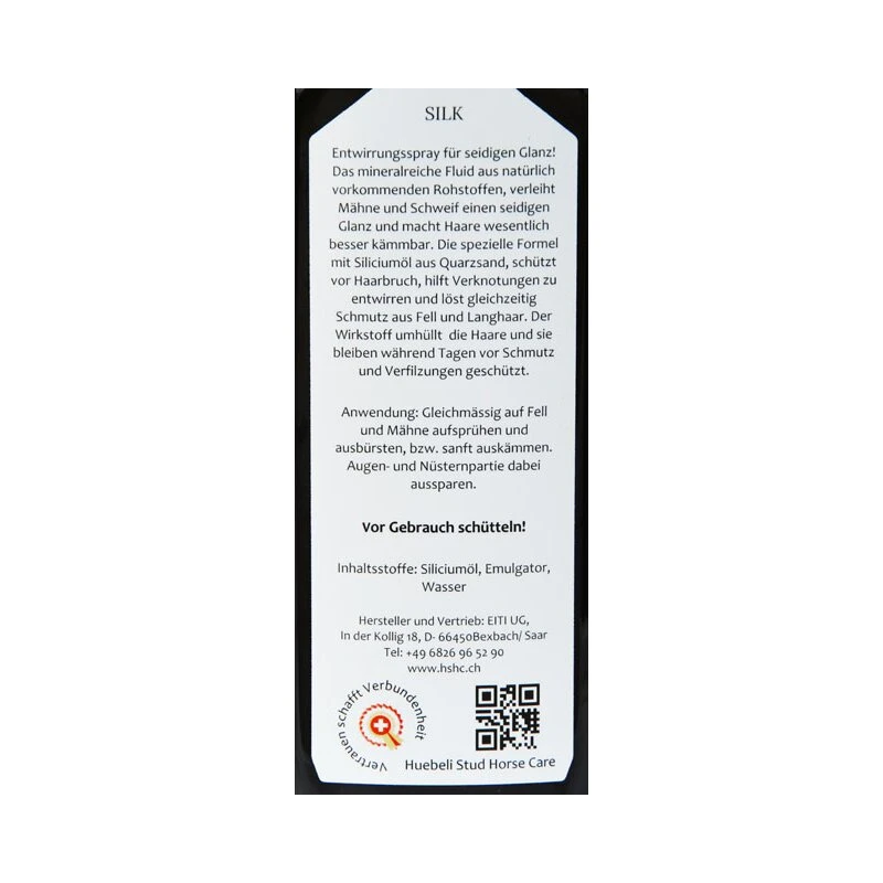 Mit dem Silk Schweif-und Mähnenspray lassen sich auch verknotete Haare schonend entwirren und weitere Verknotungen werden aktiv verhindert, da sich der schützende Wirkstoff um das Haar legt und so tagelang vor neuer Verknotung und Verschmutzung schützt.
