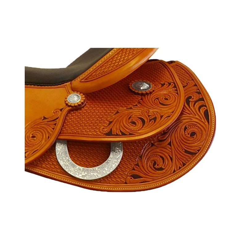 Dieser Pullman Westernsattel überzeugt optisch durch sein handpunziertes schwarz hinterlegtes Blumenmuster gepaart mit feinem Mini-Basket und gravierten D-Ringen.
